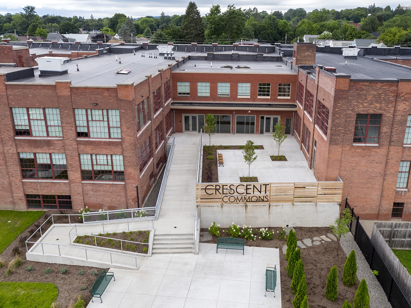 This adaptive re-use project brings new life back to the historic Crescent Commons Corset Factory, a vacant 1920’s brick building that encompasses an entire block of Main Street in Cortland. The renovated mixed-use facility features 47 market rate and affordable residential units with amenities including a lounge, exercise room, and private courtyard.